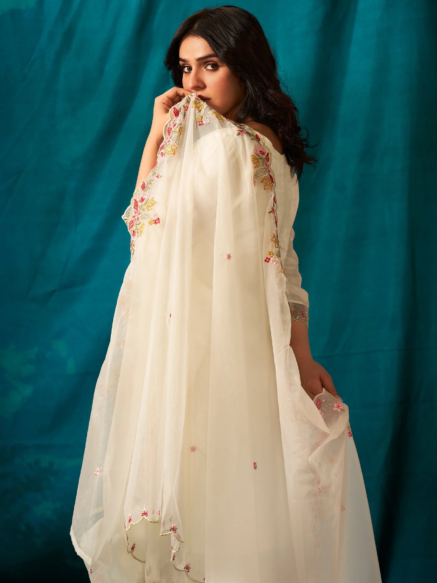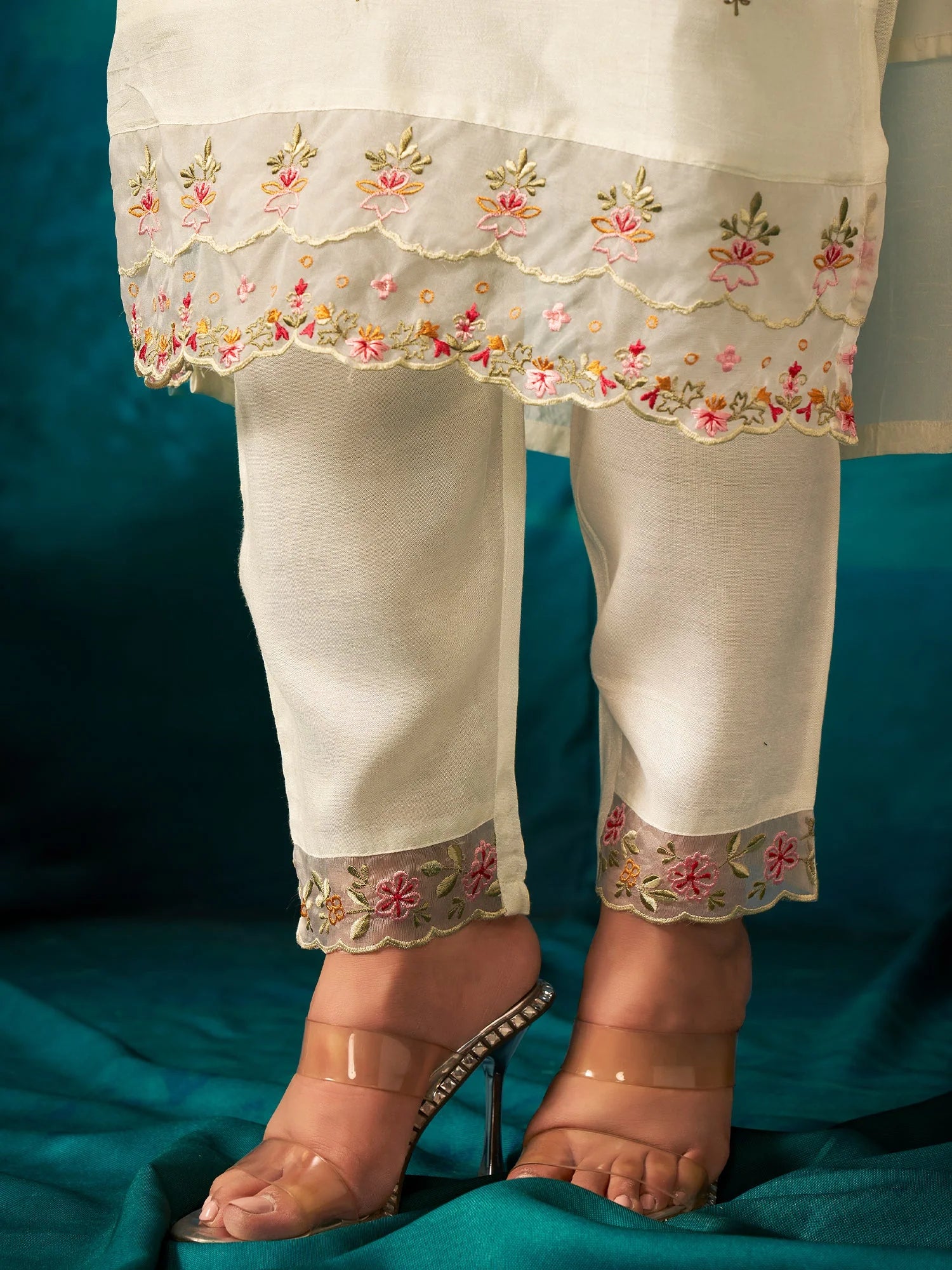 White Embroidered Silk Blend Straight Kurta Trouser With Dupatta set (Set of 3)